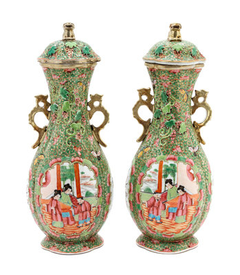 A Pair of Chinese Export Rose Famille Verte Vases with Covers