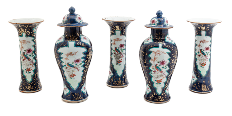 having underglaze blue with gilt decoration, polychromed reserves of birds and flower, comprising two covered jars and three flared vases.