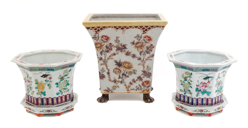 comprising a pair of octagonal pots on fitted stands and one flared rectangular pot raised on paw feet.
