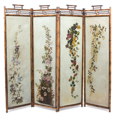 A Chinese Bamboo and Hand Painted Leather Four Panel Screen