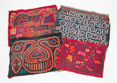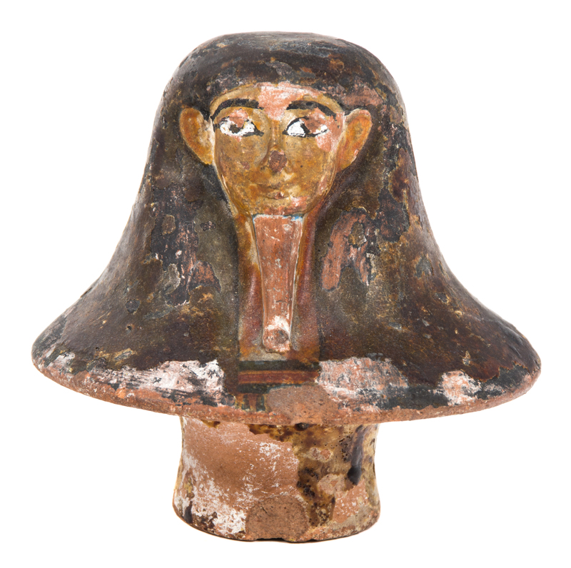 culture unknown, circa 300 C.E., having a continuous band of geometric decoration; together with a possibly 18th century Egyptian terra cotta canopic jar lid in the form of Imsety and a collection of thirteen South American textile panels.