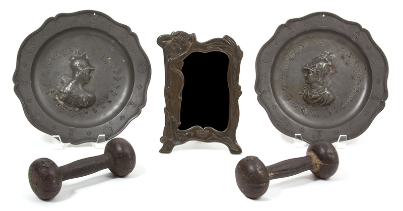 comprising two plates with faces, an Art Nouveau table mirror and a pair of hand weights.