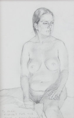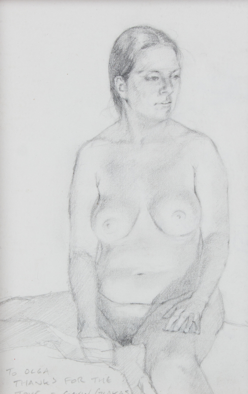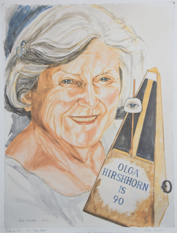 comprising a watercolor 20th/21st Century American artist, Bob Kane titled Returning from Feria de Abriel, Sevilla; a pencil drawing by 20th Century artist, Gavin Glakas titled Nude, and inscribed "Dear Olga, Thanks for the tour"; a mixed media attributed to German artist Kaspar Thomas Lenk titled Collage of Olga; a lithograph by American artist, Phillip Pearlstein titled Olga is 90 and three 33 1/3 LP vinyl records comprising Louise Nevelson: An Interview with Arnold Glimcher for the Archives of American Art.