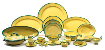 some marked Deruta, Made in Italy, in yellow with green trim, comprising 1 large platter, 7 condiment stands, 1 gravy tureen, 7 oval covered dishes, 18 covered bowls, 40 teacups, 61 saucers, 1 oval serving bowl, 1 round serving bowl, 24 demitasse cups,24 demitasse saucers, 95 luncheon plates of various size, 49 side plates of various sizes, 6 oval platters, 3 fish platters, 13 bowls, 4 round serving bowls, 2 sauce boats, 3 creamers, and 1 covered sugar; 397 items total.