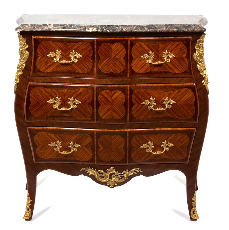 A Louis XV Style Gilt Bronze Mounted Bombe Marble Top Commode