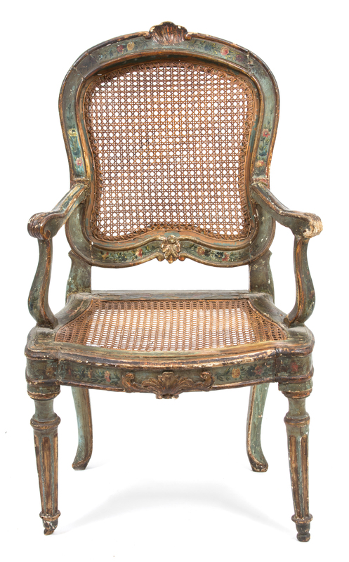 having a cartouche shaped caned back with shell carved crest and a caned seat, with polychromed floral decoration throughout.