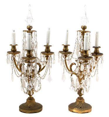 A Pair of Louis XVI Style Three-Light Gilt Bronze and Cut Crystal Candelabra