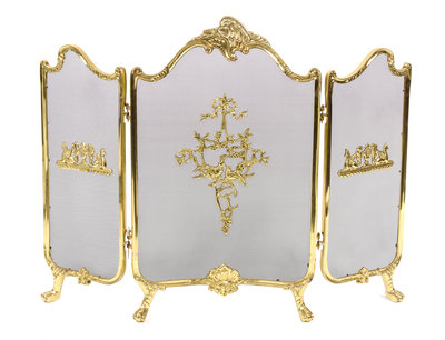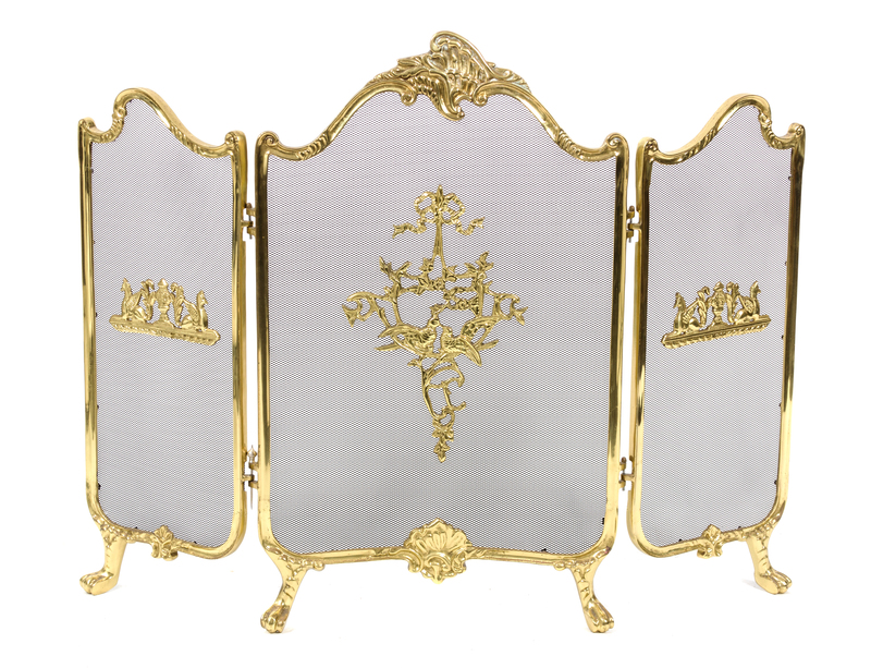 having three hinged panels, each with applied ornaments to the black mesh screen, raised on paw feet.