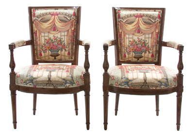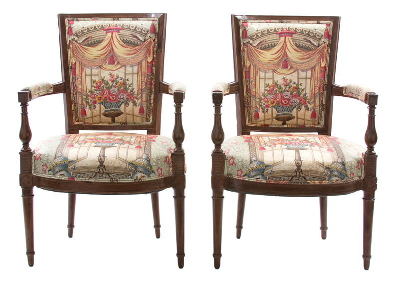 A Pair of Louis XVI Style Carved Fruitwood and Upholstered Fautueils