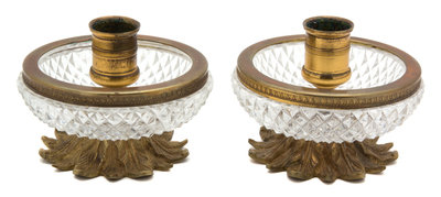 A Pair of Gilt Metal and Diamond Cut Crystal Candlesticks