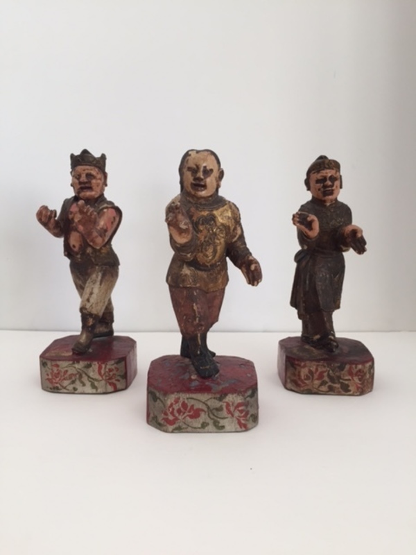 Three Chinese Polychrome Painted and Parcel-Gilt Carved Wood Figures