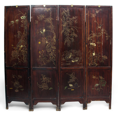 one side having raised decoration of figures in garden setting, the reverse with painted birds and insects in prunus branches.