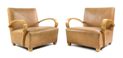 a pair of maple and leather lounge chairs