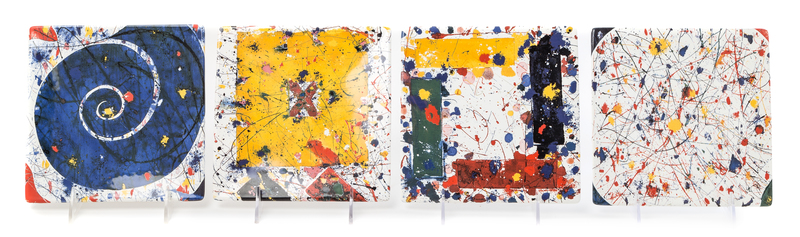 the complete set of four ceramic plates in colors, c. 2000, originally sold by the Museum of Contemporary Art, Los Angeles, each plate stamped and certified from the Sam Francis Estate, with the original box