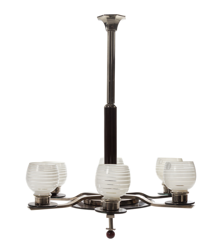 An Art Deco Six-Light Chrome, Wood and Opaline Glass Chandelier