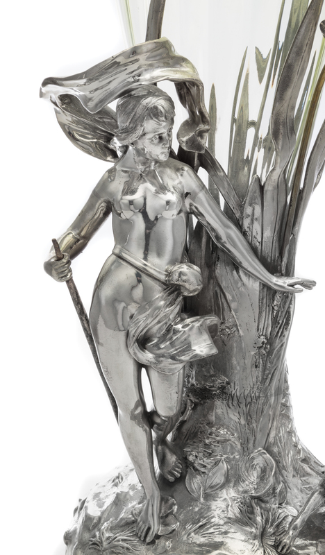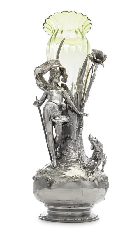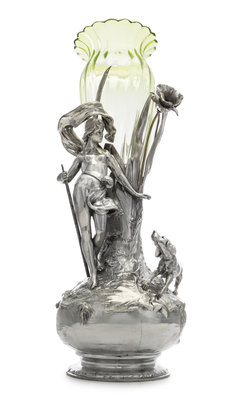 An Art Nouveau Silvered Metal and Blown Glass Figural Vase
