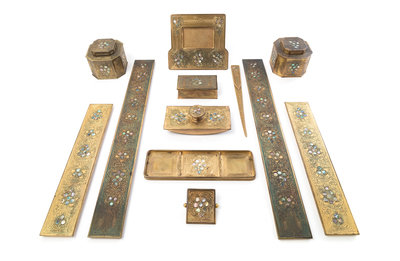 an Abalone pattern ten-piece desk set, comprising: two ink wells (1157), rocker blotter (1164), picture frame (1166), pen tray (1159), stamp box (1158), short blotter ends (1153), long blotter ends (1152), paper clip (1165) and a letter opener (1163)