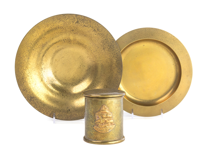 a set of three bronze dore articles, comprising: a small dish (1742), a larger dish (1703), and a covered container (135)