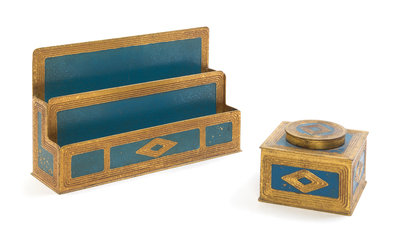 a set of two Graduate pattern desk articles, a letter rack (1803) and inkwell (1801), with two additional bronze chargers (1708, 1750)