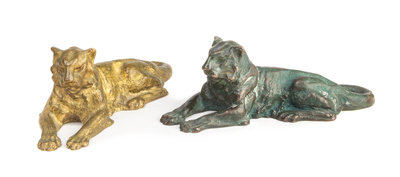 a pair of bronze recumbent lion paperweights (932)