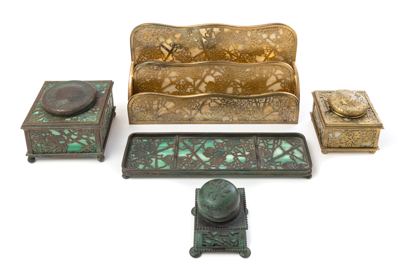 a set of four Grapevine pattern desk articles, comprising a large inkwell (844), small inkwell (845), pen try (1004) and a letter holder (1008), with an additional small covered inkwell marked NY and stamped 221