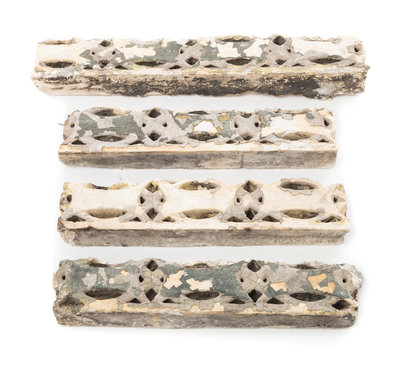 a set of four interior auditorium frieze fragments from the Schiller, or Garrick, Theater Building, Chicago, Illinois, 1891fabricated by Decorators Supply Corp., Chicago, Illinois