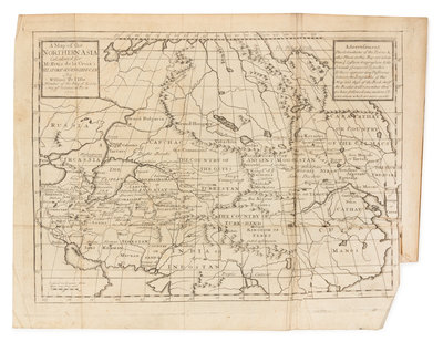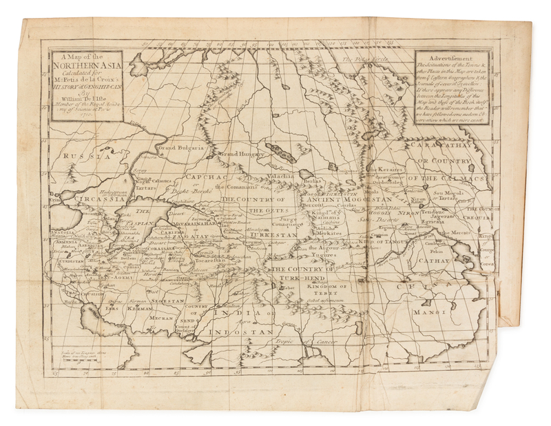 The History of Genghizcan the Great, First Emperor of the Antient Moguls and Tartars; In Four Books... London: J. Darby, 1722.8vo (192 x 120 mm). Folding engraved map. (Light marginal spotting or soiling, old tape repairs.) ORIGINAL BOARDS (upper cover detached, small loss to head of spine, discreet library labels to spine and upper cover with associated markings). FIRST EDITION in English. Petis de la Croix first edited and published his father's authoritative biography of Genghis Khan in 1710. In 1722, he translated his work to English.