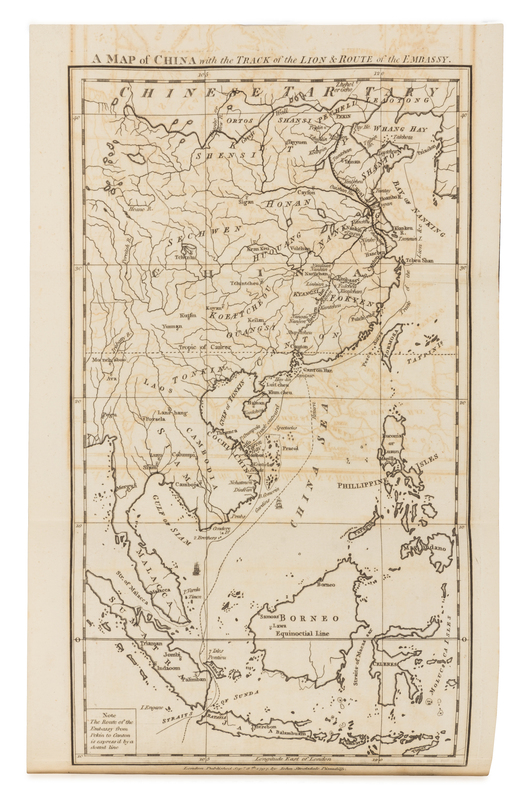 A Historical Account of the Embassy to the Emperor of China, undertaken by order of the King of Great Britain London: John Stockdale, 1797.2 volumes, 8vo (210 x 130 mm). 2 engraved folding maps, numerous plates and illustrations. (Spotting and browning throughout.) Contemporary half calf, marbled boards, gilt-lettered (worn, lightly soiled, discreet library label). For many English readers, Staunton's work offered the first opportunity to understand the Chinese government, technologies, agriculture and culture from a first-hand narrative.