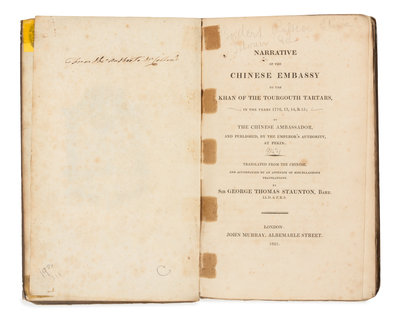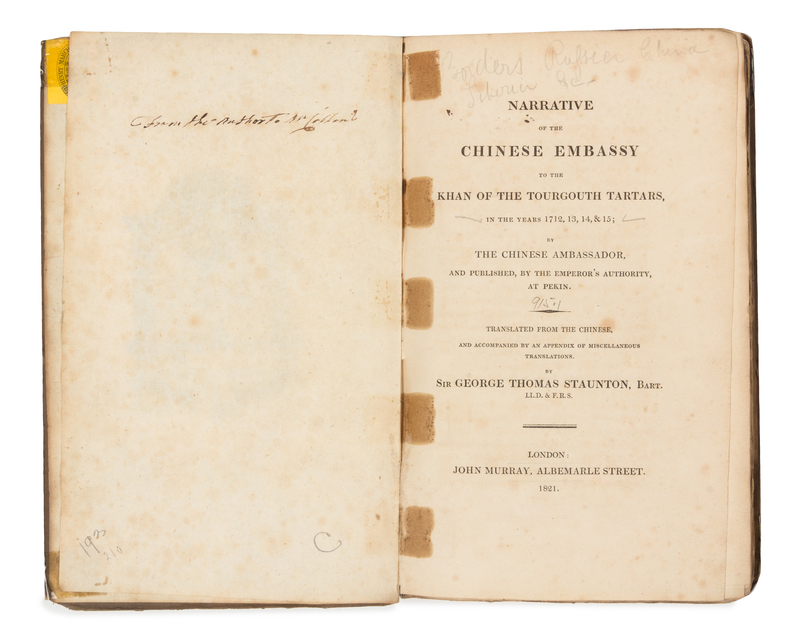 Narrative of Chinese Embassy to the Khan of the Tourgouth Tartars, in the years 1712, 13, 14, and 15; by the Chinese Ambassador, and Published, by the Emperor's Authority at Pekin. London: John Murray, 1821.8vo (230 x 140 mm). Hand-colored folding map. (Old tape repairs, spotting.) ORIGINAL BOARDS (old tape repairs, rebacked, discreet library label on spine). FIRST EDITION, in English. Staunton edited this narrative by a Chinese envoy, Tulisen, who accompanied a mission in 1712-1715 to Tourgouth Tartars in southern Russia.