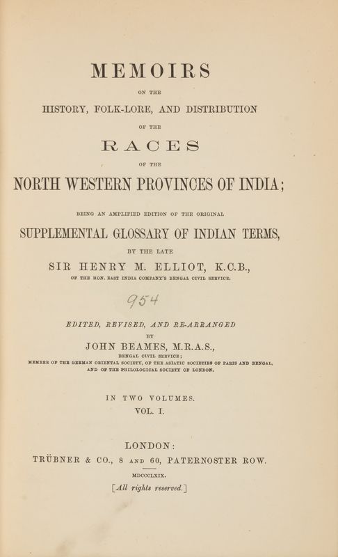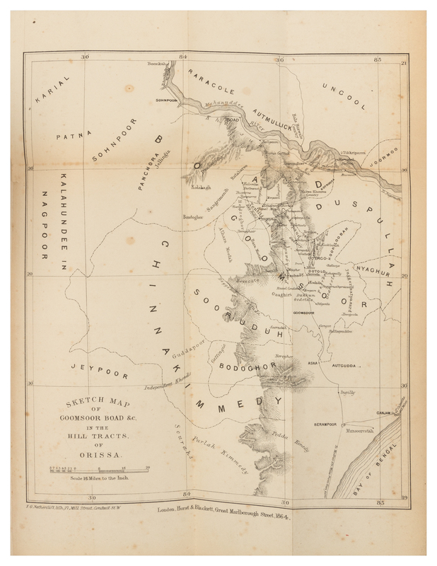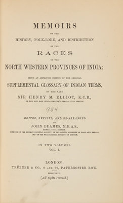 A group of works about India, comprising: ANDREW, W.P. Memoir on the Euphrates Valley Route to India. London: Wm. H. Allen, 1857. Later leather. FIRST EDITION. - R.B. [CROUCH, Nathaniel] The English Acquisitions in Guinea and East-India. London: Nath. Crouch, 1708. Original tan boards. - CAMPBELL, John. A Personal Narrative of Thirteen Years Service Amongst the Wild Tribes of Khondistan. London: Hurst and Blackett, 1864. Half brown morocco. FIRST EDITION. - ELLIOT, Henry. Memoirs on the History, Folk-lore and Distribution of the Races of the Northwestern Province of India. London: Trubner, 1869. 2 volumes. Publisher's red cloth. - Together, 4 works in 5 volumes, 8vo and 12mo, condition generally good. Provenance for the Lot: Wisconsin Consistory Library (bookplate).