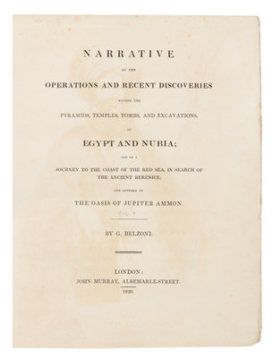 Narrative of the Operations and Recent Discoveries Within the Pyramids, Temples, Tombs and Excavations in Egypt and Nubia London: John Murray, 1820.4to (270 x 205 mm). Portrait frontispiece. (A few marginal tears, some affecting text, spotting.) ORIGINAL BOARDS, gilt-lettered spine (spine perished, upper cover detached). FIRST EDITION. A published work on archaeology and exploration, during a time when archaeology and looting were closer in association than present time.