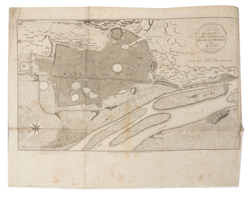 Travels in Africa, Egypt and Syria, from the Year 1792-1798. London: T. Cadell and W. Davies, 1806.4to (267 x 206 mm). 2 Plates, one as the frontispiece, 3 folding maps. (Slight tears to maps, spotting, tape repairs and residue.) Contemporary half calf, marbled boards, spine in 6 compartments, gilt-lettered in second (upper cover and front-facing endpaper detached, spine worn, discreet library label on spine). Second edition, enlarged. "This important work contains the earliest information in English about Darfur (Sudan)... Browne was the first European to describe Darfur, which he reached with a Sudanese caravan in 1793..." (Blackmer 219).