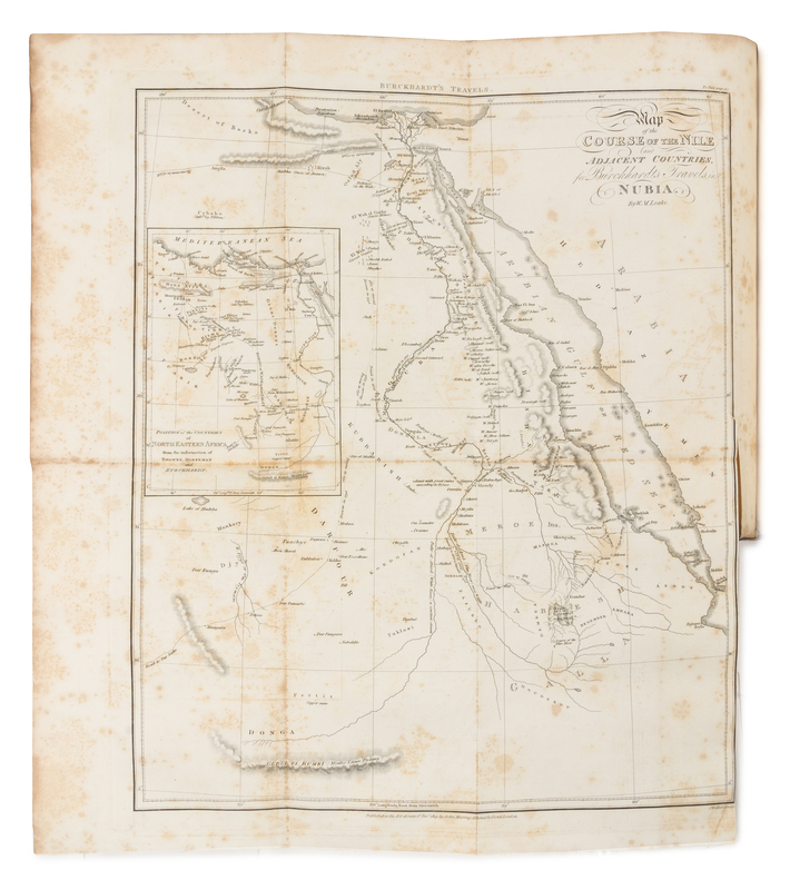 Travels in Nubia. London: John Murray, 1819.4to (277 x 211 mm). Portrait frontispiece, 3 engraved maps, (2 folding). (Light spotting or offsetting.) Publisher's black cloth, gilt-lettered (joints rubbed, light wear, discreet library label). FIRST EDITION of Burckhardt's posthumously published journals, edited by William Leake, of his journey down the Nile and across the Nubian desert in 1813 and 1814, on behalf of the African Association; this was - his first published work.