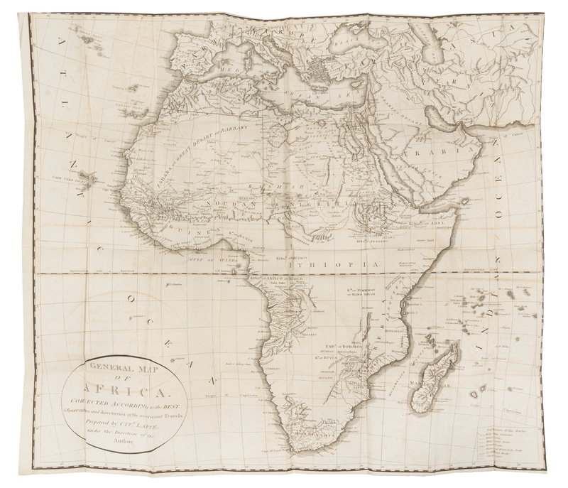 Travels in Africa Performed in the Years 1785, 1786 and 1787, in the Western Countries of that Continent... London: James Ridgway, 1802.2 volumes, 12 mo (160 x 95 mm). Numerous folding maps and charts. (Marginal spotting.) Contemporary calf, spine gilt-lettered (rubbing and wear to boards, discreet library label). Blagdon covers the various branches of natural history, resulting from the geological, topographical, botanical, physiological, mineralogical and philosophical researches.