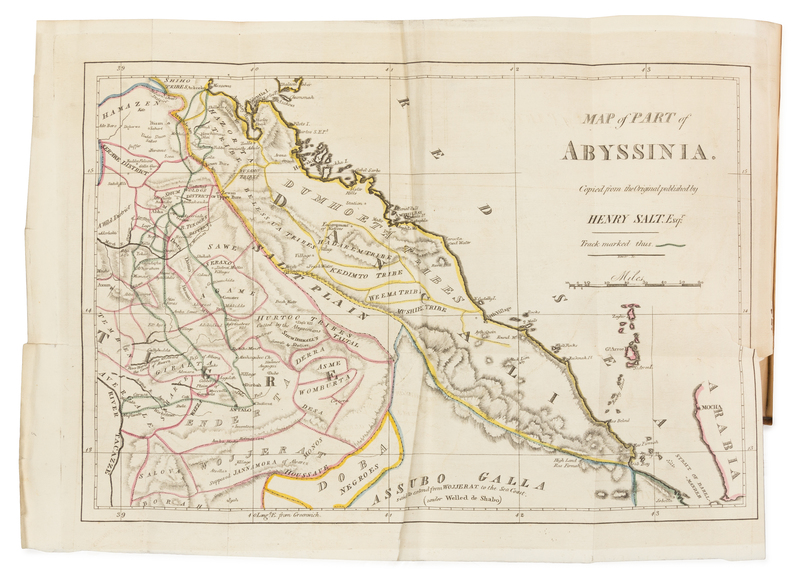 A Voyage to Abyssinia, and Travels into the Interior of that Country, Executed under the Order of the British Government, in the years 1809 and 1810. Philadelphia: M. Carey, 1816.8vo (215 x 125 mm). Half-title, hand-colored engraved folding map. (Small tear to map on verso, old tape repairs.) Contemporary half leather, marbled boards, gilt-lettered spine (joint splitting, worn, old tape repairs). FIRST AMERICAN EDITION, including an account of the Portuguese settlements on the east coast of Africa, a concise narrative of the events in Arabia Felix, and information about the Aboriginal African tribes and their languages.