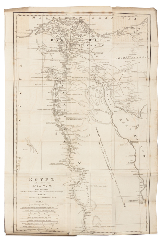 Travels in Upper and Lower Egypt... Translated from French by Henry Hunter, D.D. London: John Stockdale, 1807.3 volumes, 8vo (210 x 112 mm). Engraved portrait frontispiece of Sonnini by P. Thomson, and illustrations of views, maps, plans, some folding. (Offsetting, spotting throughout.) Contemporary calf, spine gilt-lettered (spine perished, old tape repairs, discreet library labels). Later edition.
