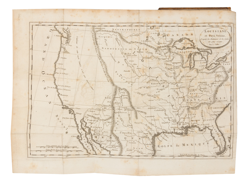 Voyage a la Louisiane, et sur le Continent de l'Amerique Septentrionale, fait dans les Annees 1794 a 1798. Paris: Dentu, 1802.8vo (200 x 124 mm). Half-title, engraved folding map. (Scant spotting). Calf backed boards, spine gilt (Head of spine with loss, upper cover detached.). FIRST EDITION, "principally occupied with a resume of the history of the country purported to be visited, with scarcely nothing of personal observation...his owrk is pirncipally notable for 'Two Vocabularies of the Savages,' the Naoudoouessis and the Chipouais" (Field 99). Sabin 3979.