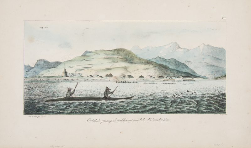 A pair of hand-colored lithographic prints from Voyage pittoresque autour du monde, avex des portraits de sauvages d'Amrique, d'Asie, d'Afrique, et des iles du Grand Ocean, [Paris: Firmin Didot, 1822], comprising:Oululuk principal tablissemt. sur l'le d'Ounalachka. (Plate 80). (Light marginal chipping.)Vue du port d'Ounalaschka (Kapitanskaya havan). (Plate 84). (A few pale stains.)Two fine views of Unalaska in the Aleutian Islands from Choris' "elaborately handsome work by the artist with Kotzebue's 1816 expedition in which a long visit was made to the Pacific coast from California to Bering's sea" (Howes). Images 153 x 326 mm (246 x 417 mm sheets).