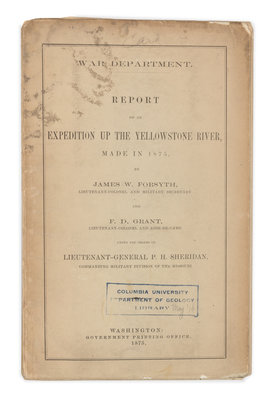 War Department. Report of an Expedition up the Yellowstone River, Made in 1875. Washington: Government Printing Office, 1875. 8vo (231 x 147 mm). One folding map, 5 plates. (Some pale staining.) ORIGINAL WRAPPERS, stab-sewn (disbound). Forsyth's day-by-day narration of his expedition from Fort Buford up the Yellowstone, with Grant's report to suppplement. The plates depict the mouths of the Powder, River, Yellowstone, Big Horn, Castle Rocks, and Pryor's Creek. RARE: according to online auction records, only 3 copies of this work have appeared at auction in the last 35 years. Eberstadt 112:149.