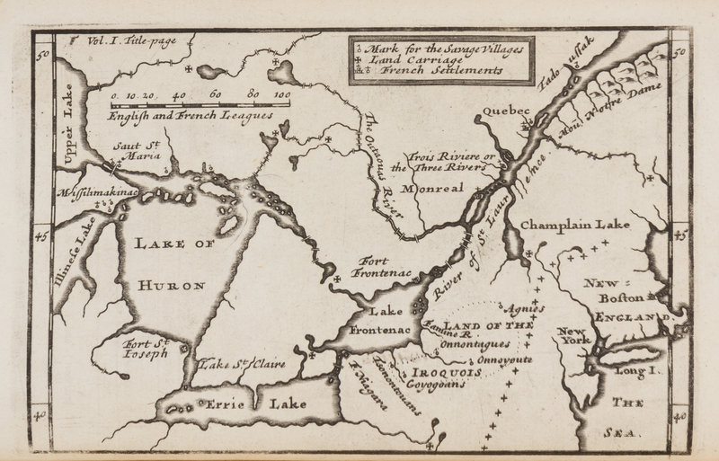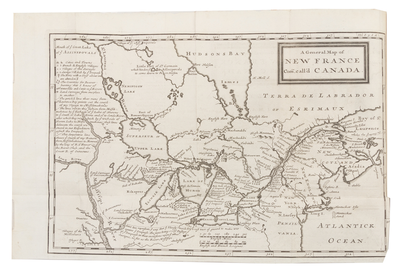New Voyages to North-America. London; for J. and J. Bonwicke and others (vol.I), J. Walthoe and others (vol.II), 1735.2 volumes, 8vo (200 x 123 mm). 10 engraved maps and plates (a few folding). (Short tear to fold of folding map, some light offsetting.) Modern red half morocco, marbled boards by Bayntun Riviere. Second edition, Bonwicke issue. Lahontan arrived in New France in 1683. In 1687, after traveling west with Duluth, he was granted command of Fort St. Joseph on the St. Clair River. In 1688, he traveled via the Fox-Wisconsin portage to the upper Mississippi. His work is considered to contain one of the earliest comprehensive descriptions of the western part of the continent. Sabin 38645.