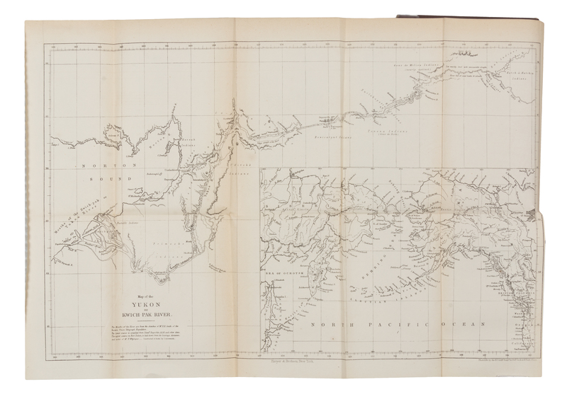 Travel and Adventure in the Territory of Alaska, Formerly Russian America - now Ceded to the United States - and in Various other Parts of the North Pacific. New York: Harper and Brothers, 1869.8vo (221 x 130 mm). Frontispiece, folding map, numerous illustrations. (Some light marginal spotting.) Publsiher's brown pictorial cloth (spine ends lightly chipping, corners bumped, lower hinge starting). FIRST AMERICAN EDITION. A narrative on Whymper's travels which included Kamchatka, the west coast of the Okhotsk Sea, and the Yukon River.