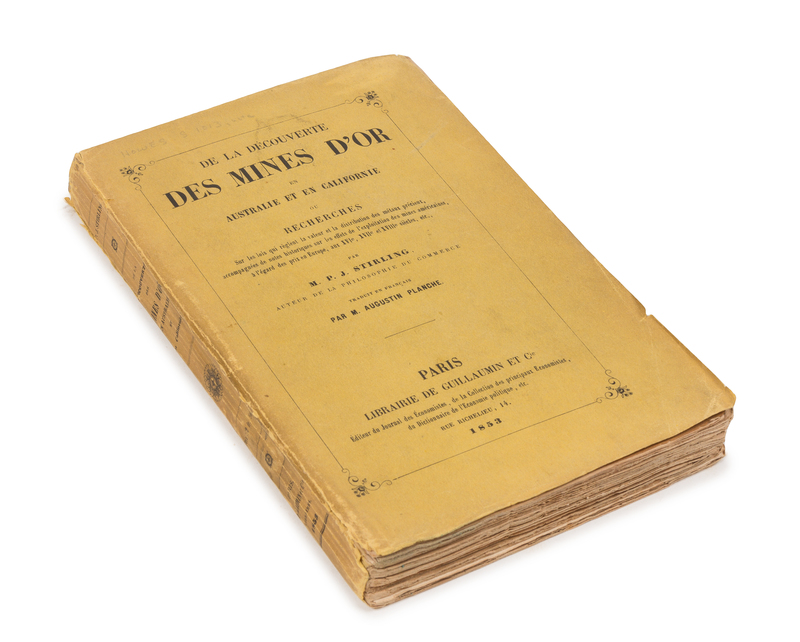 De la decouverte des mines d'or en Australie et en Californie. Paris: LIbrairie de Guillaumin et cie, 1853. 12mo (185 x 120 mm). Half-title, folding table. (Some light spotting). ORIGINAL PRINTED WRAPPERS (some light soiling, spine ends just chipping). FIRST FRENCH EDITION of Stirling's work which was first published in Edinburgh in the same year, entitled "The Australian and Californian Gold Discoveries and their Probable Consequences." See Howes S-1013; Sabin 91852.