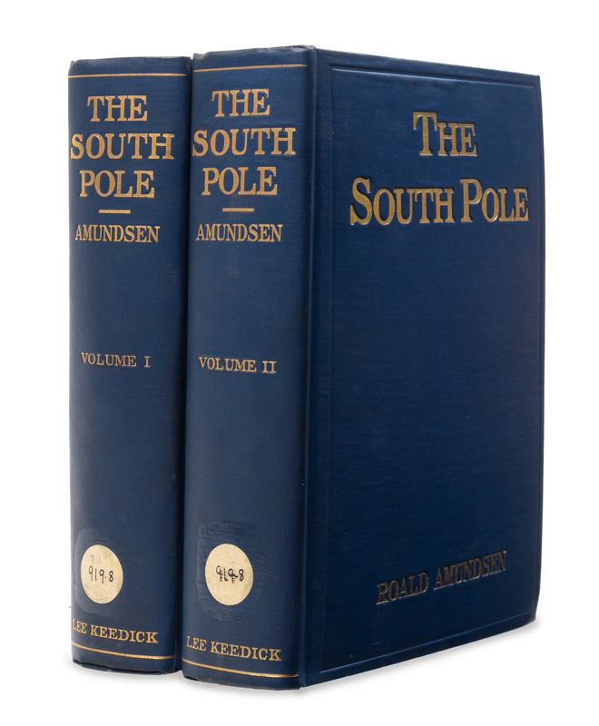 The South Pole: An Account of the Norwegian Antarctic Expedition in the "Fram," 1910-1912. New York: Lee Keedick, 1913. 2 volumes, 8vo. Frontispiece and numerous illustrations, half-titles. (Frontispiece detached in volume II.) Publisher's blue gilt-lettered cloth, top edges gilt (minor shelf-wear, discreet library label on spine). FIRST EDITION in English, American issue. Roald Amundsen was a Norwegian explorer and the leader of the Antarctic Expedition of 1910-1912.