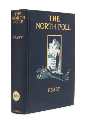 The North Pole. Its Discovery in 1909 under the Auspices of the Peary Arctic Club. Introduction by Theodore Roosevelt. New York: Frederick A. Stokes, 1910.8vo. Numerous plates, folding colored map. Publisher's pictorial blue cloth (rubbing to edges, discreet library label on spine). Second edition. Peary was the first to reach the North Pole.