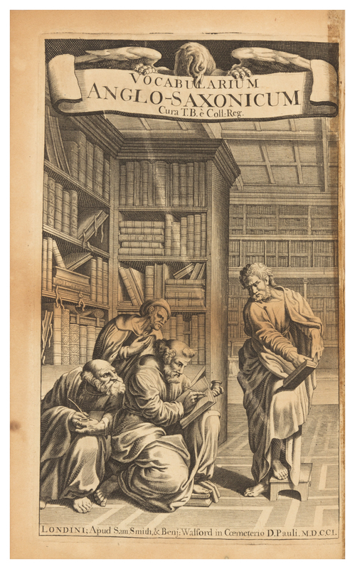 Vocabularium Anglo-Saxonicum, Lexico Gul. Somneri Magna Parte Auctius. Oxford: Sheldonian Theater (on engraved title: London, Sam Smith and Benj. Walford), 1701.8vo (216 x 140 mm). Additional engraved title-page, engraved title vignette, printed in double-column. (Hinging with tape repairs, marginal spotting and soiling.) Full contemporary calf, spine in 6 compartments with 4 raised bands, gilt-lettered in the second (overall rubbing and wear to boards and spine, joints split with tape repairs, discreet library label). FIRST EDITION. The printing in double-column with Peter de Walpergens pica Anglo-Saxon type was used in this book for the first time. Provenance: William R. Smith (bookplate).