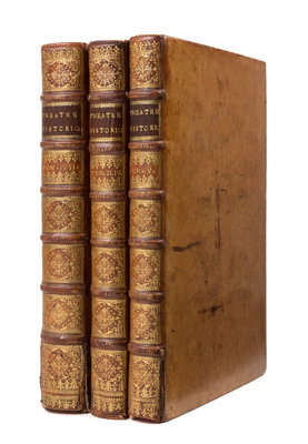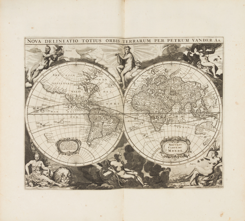 Le Grande Theatre Historique, ou nouvelle histoire universelle, tant sacree que profane. Leiden: Pierre Vander Aa, 1703. 5 volumes in 3, folio (386 x 243 mm). 5 half-titles, engraved frontispiece, titles printed in red and black, numerous engraved plates (many double-page), double-page world map, engraved vignettes in text. Contemporary tan calf, spines in 7 compartments with 6 raised bands, gilt-lettered in one, 5 with gilt foliate pattern, brown morocco gilt lettering-piece in one, board edges gilt, edges red (some very light wear to extremities, 2 volumes with lower upper joints just splitting).