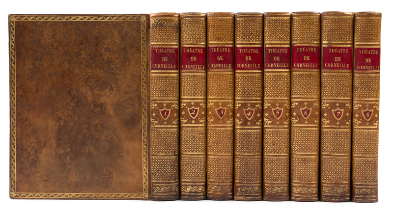 Thatre de P. Corneille, avec des commentaires [par Voltaire] et autres morceau intressans. Geneva [Berlin]: n.p., 1774. 8 volumes, 4to (247 x 195 mm). Engraved frontispiece, approximately 34 engraved plates after Gravelot, text printed within borders. CONTEMPORARY FRENCH TREE CALF, covers with gilt borders, smooth spines with gilt diaper pattern and borders, red morocco lettering-pieces gilt, board edges gilt, edges sprinkled red (3 volumes with discreet early repairs to spine ends or hinge). A FINE COPY.