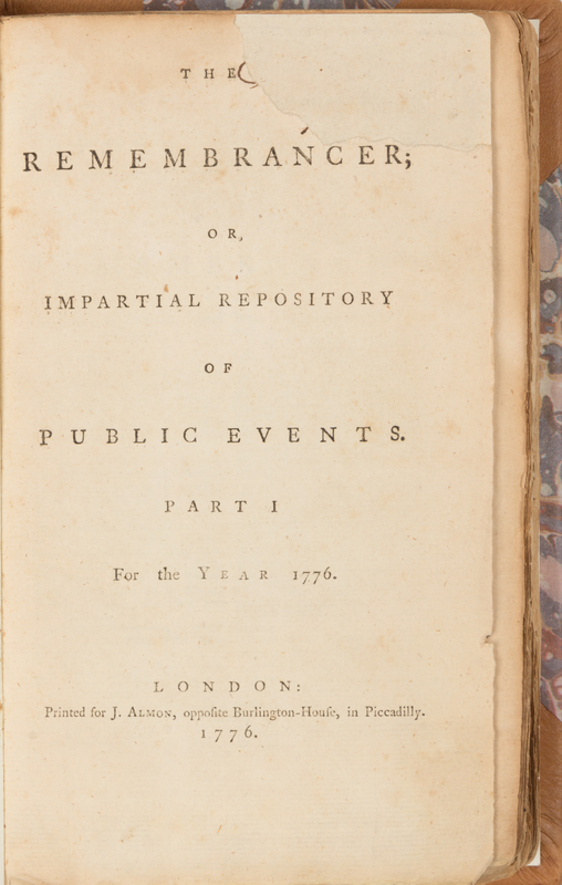 the Remembrancer, or Impartial Repository of Public Events. Part I[-II] for the Year 1776. London: for J. Almon, 1776.2 volumes, 8vo (225 x 145 mm). (Titles recornered, a few leaves with marginal repairs not affecting text, a few leaves wormed Part I.) Modern half leather, preserving uncut edges. FIRST EDITION, CONTAINING THE FIRST ENGLISH PRINTING OF THE DECLARATION OF INDEPENDENCE. The Remembrancer, published in 17 volumes between 1775 and 1784, is "one of the chief and... most reliable sources of information regarding the revolution. It is a veritable mine of information, containing every authentic paper relative to the American Revolution, whether published in England or America, by the British Ministry or the American Congress, and is even today the original authority from which much of our information is obtained" (Church). The Declaration of Independence is printed in Part II, pp.258-260. RARE: according to American Book Prices Current, only two copies have appeared on the market in the last 40 years. Howes A-182; Sabin 955.
