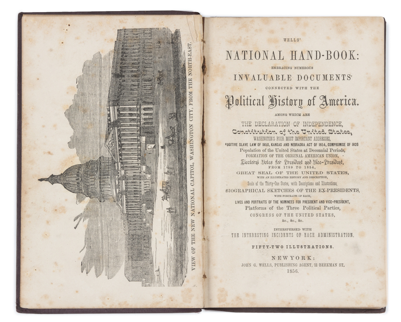 A group of works about American History, comprising: DWIGHT, Theodore, Jr. The Northern Traveller... New York: John P. Haven, 1841. Publisher's brown cloth. - The Northern Traveller, and Northern Tour... New York: Goodrich and Wiley, 1834. Publisher's light brown cloth. - HOOK, R. and G.D. Through Dust and Foam; or, By Land and Sea in the Far West and Far East. Hartford: Columbian Book Company, 1876. Publisher's half green morocco, green cloth. - LAWRENCE, J.W. Foot-Prints; or, Incidents in Early History of New Brunswick. Saint John: J. & A. McMillan, 1883. Publisher's blue cloth. PRESENTATION COPY, inscribed by Lawrence. - WELLS. Wells' National Hand-Book: Embracing Numerous Invaluable Documents Connects with the Political History of America... New York: John G. Wells, 1856. Publisher's brown cloth. - WEST, Benjamin. The New-England Almanack...Providence: John Carter, [1776]. Folded and stab sewn. - First Ten Annual Reports of the American Board of Commisioners for Foreign Missions, with Other Documents of the Board. Boston: Crocker and Brewster, 1834. Publisher's red cloth. - Together 7 works in 7 volumes, 8vo and 12mo, condition generally fine.