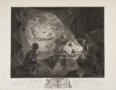 The Tea-Tax Tempest, or the Anglo American Revolution. [Nuremberg: Carl Guttenberg,] 1778.Engraving, image 330 x 432 mm (424 x 540 mm sheet). (Outer edges renewed on verso.) An adaptation, in reverse, of John Dixon's The Oracle of 1774. "Time, with a magic-lantern, throws upon a curtain an allegorical representation of revolution in Amerca. He points this out to four female figures personifying the four quarters of the world. Dixon's Britannia, Hibernia, and Scotia have been transformed into Europe, Asia, and Africa." (see Stephens & George, Catalogue of political and personal satires preserved in the Department of Prints and Drawings in the British Museum, 5490).
